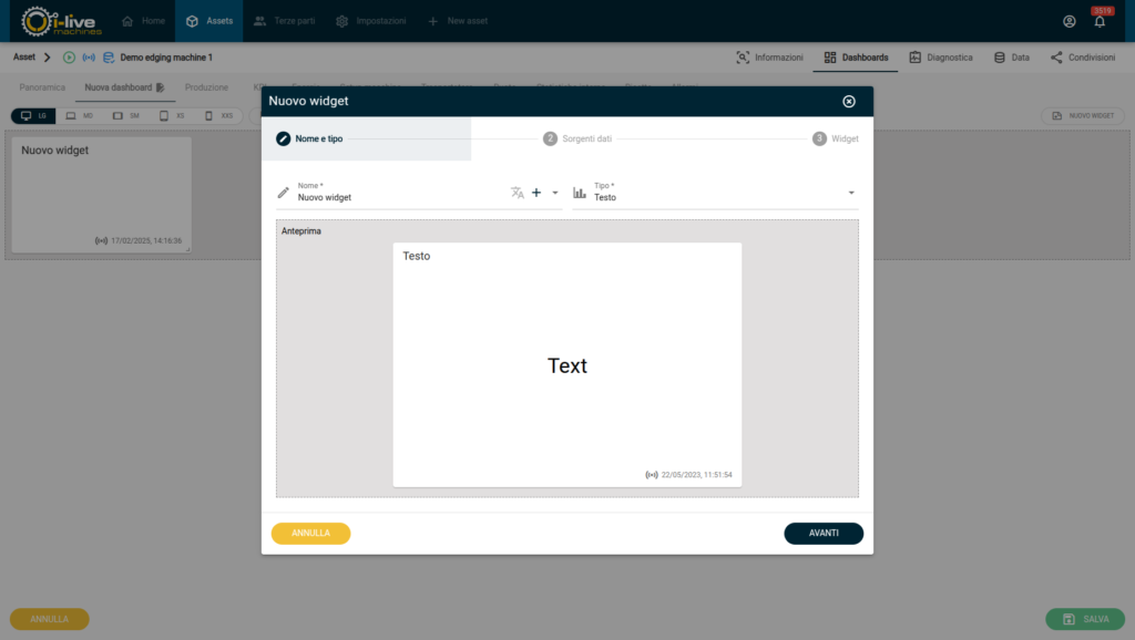 Qui è possibile inserire il nome del widget e sceglierne la tipologia; selezionando uno qualsiasi dei tipi widget disponibili, un’anteprima viene visualizzata.