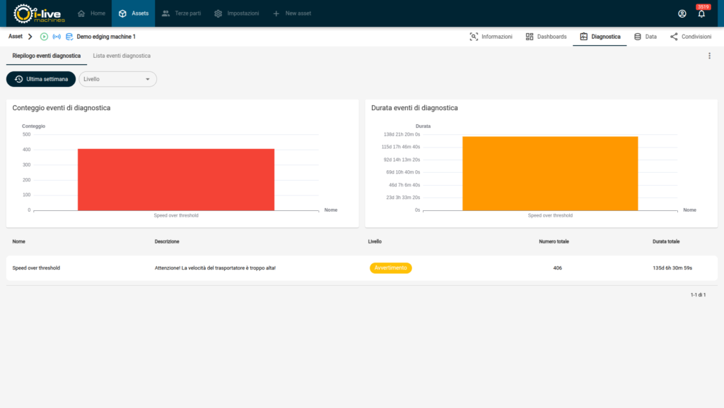 In questa pagina è possibile visualizzare gli eventi di diagnostica che sono scattati nel periodo di tempo selezionato dal filtro.