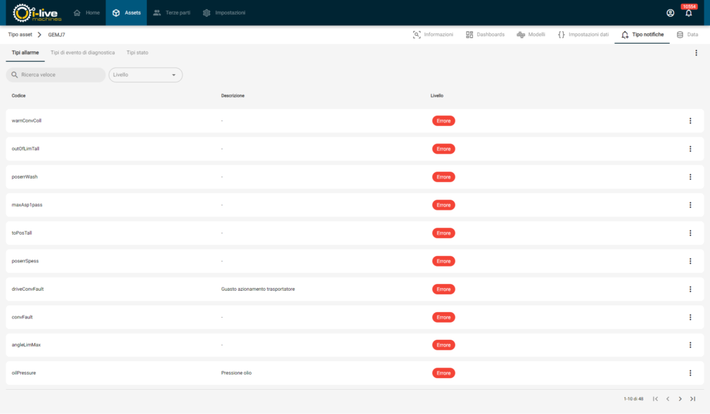 In questa pagina è possibile gestire i vari tipi di allarme configurati per il tipo di asset.