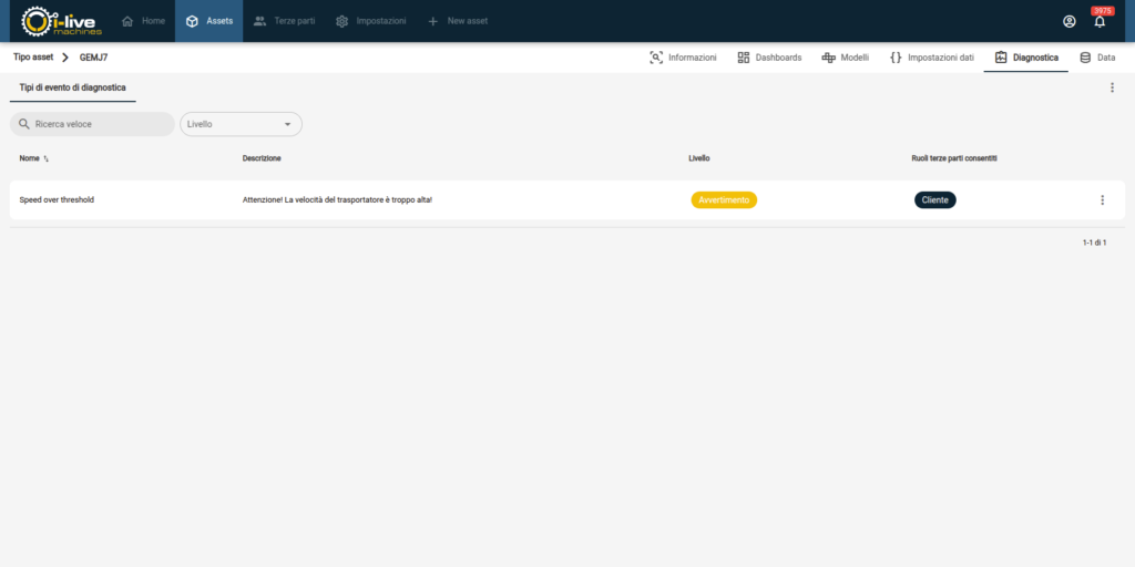 È possibile inserire un nuovo tipo di evento di diagnostica, cliccando il bottone presente in alto a destra (tre puntini) sotto la barra del menù; possono avere svariati gradi di difficoltà, (es. verifiche valori sopra una determinata soglia, confronti tra valori, ecc.)