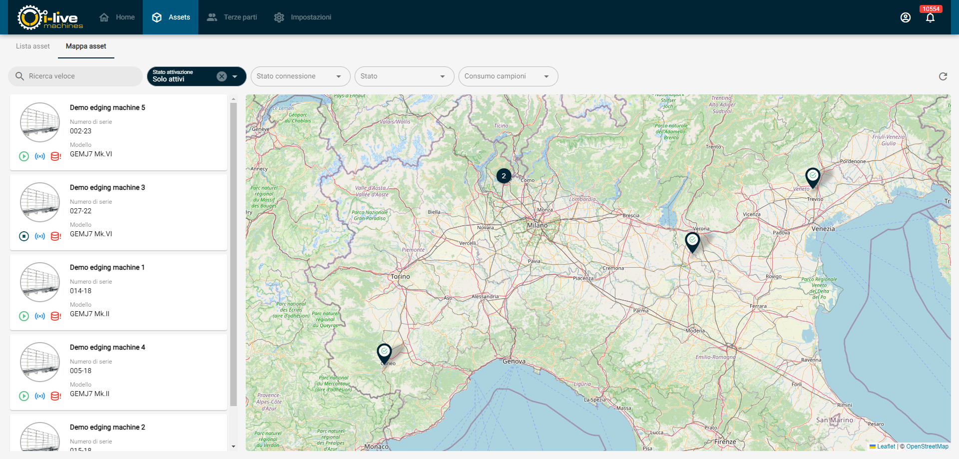 All’interno della sezione Mappa asset è possibile visualizzare tutti gli assets presenti nel sistema rappresentati sulla mappa geografica sotto forma di marker.