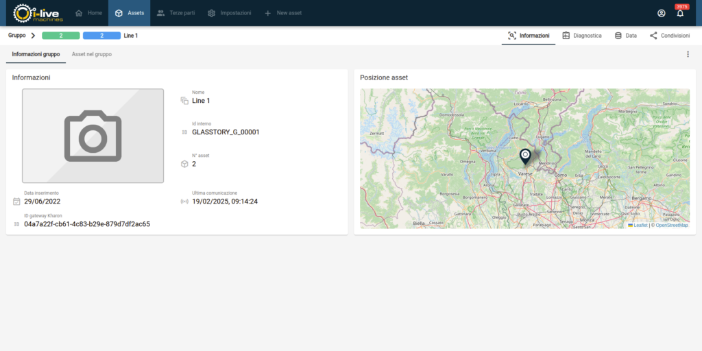 Nel riquadro Informazioni viene mostrato l’eventuale logo, il nome, l’ID interno associato al gruppo, il n° di asset associati al gruppo, la data di inserimento e l’ultima comunicazione.