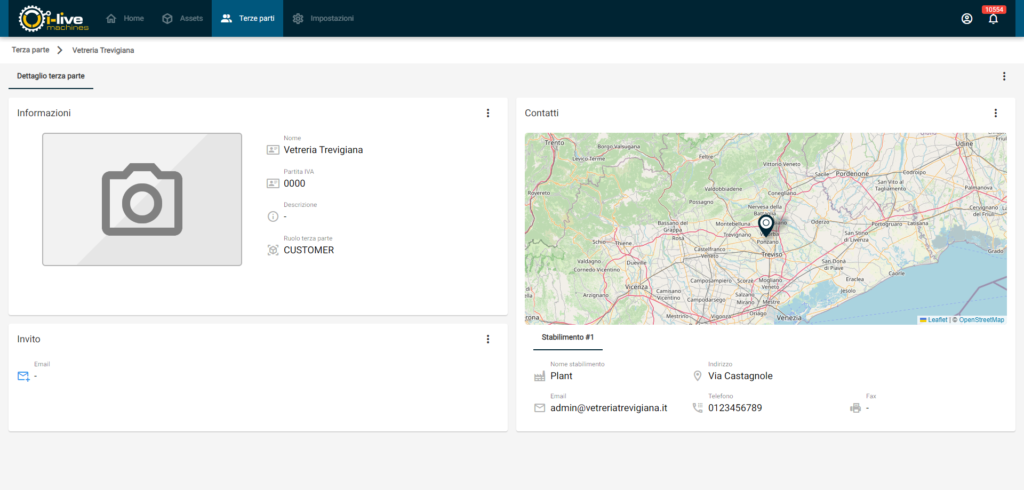 Nel riquadro Contatti viene mostrata una mappa con tutti gli stabilimenti associati alla terza parte, con le relative informazioni (nome stabilimento, indirizzo, email, telefono, fax).